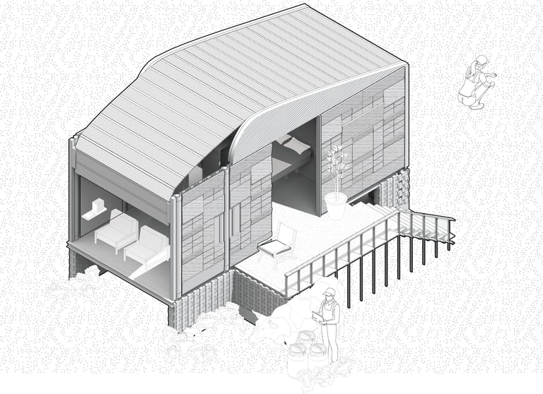Micro housing project in Les Cayes, Haiti, realized through a four-person collaborative effort, focused on delivering compact, sustainable residential solutions that address local needs and community resilience through thoughtful, resource-efficient design​